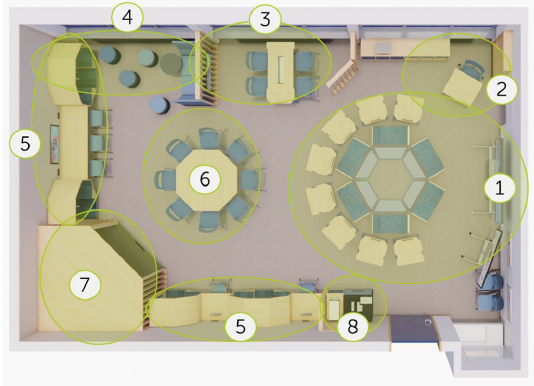 Räume sollen flexibel nutzbar, motivierend, übersichtlich und ansprechend gestaltet sein, damit sie verschiedene Lernsettings (Plenum, Gruppen, Einzelarbeit, Rückzug) ermöglichen. - Der Raum als wirksamer Rahmen