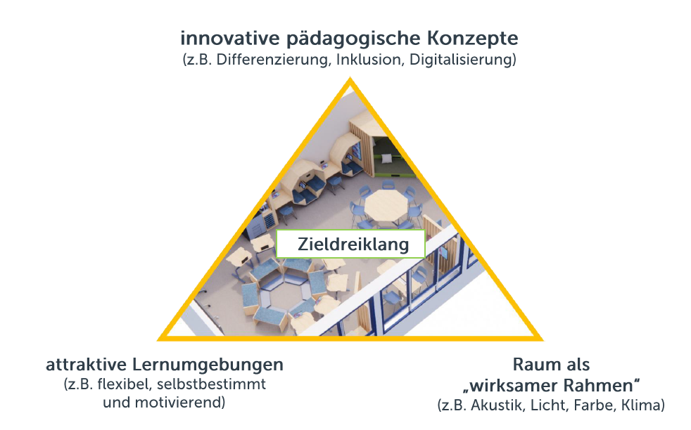 Das Modellklassenzimmer folgt einem Zieldreiklang, der drei Bereiche miteinander verbindet: